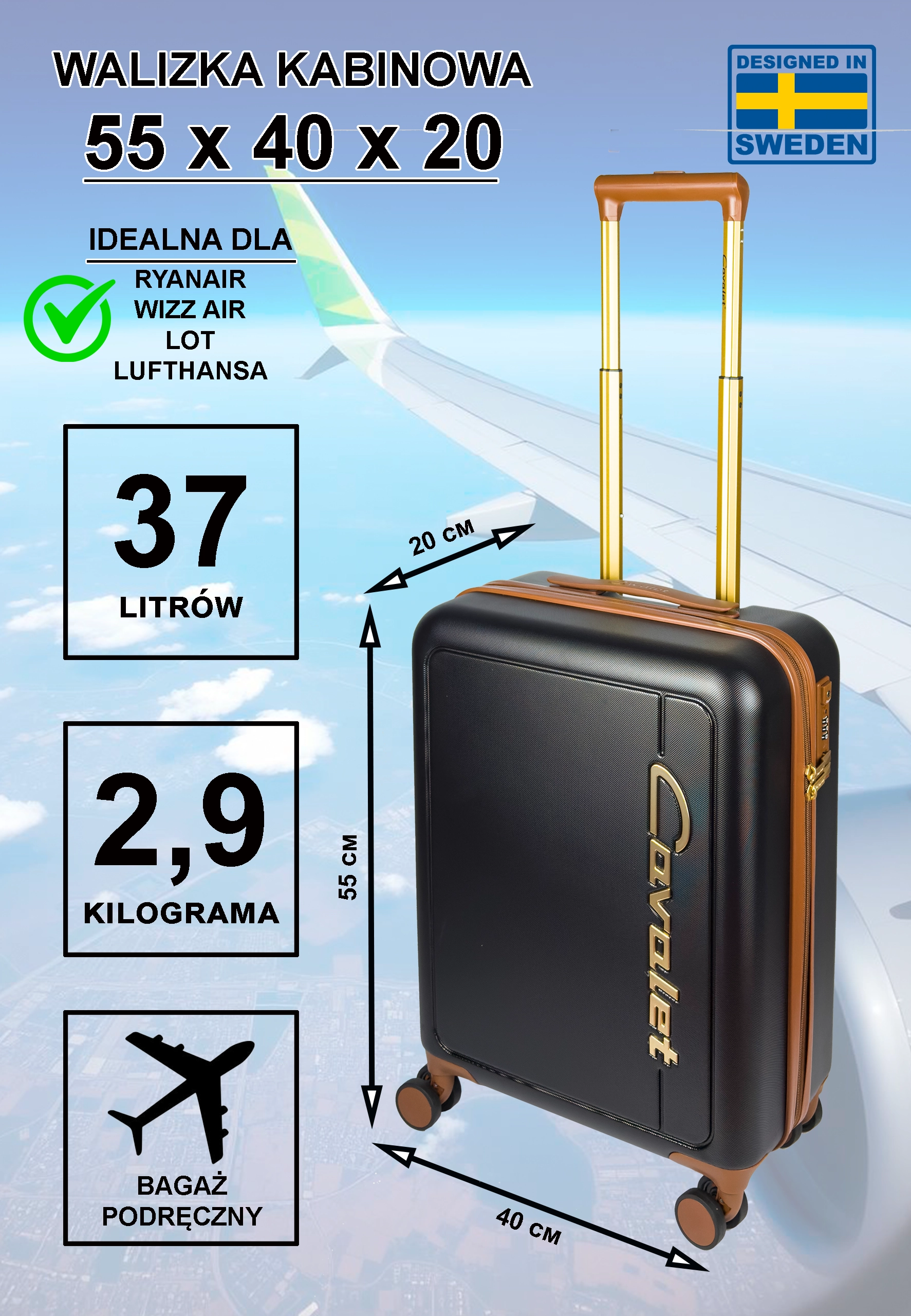Walizka podręczna Cavalet Viken czarna jest zgodna z limitami bagażu podręcznego WizzAir, Ryanair (Priority), LOT, Lufthansa, EasyJet i Norwegian, gwarantując bezproblemową podróż.